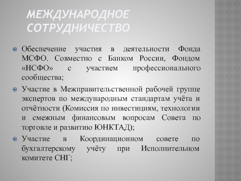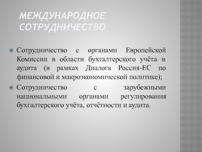 Сотрудничество с зарубежными национальными органами регулирования бухгалтерского учёта, отчётности и аудита.