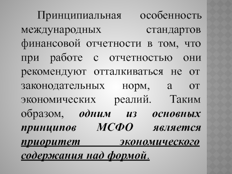 а от экономических реалий. Таким образом, одним из основных принципов МСФО является приоритет экономического содержания над формой.