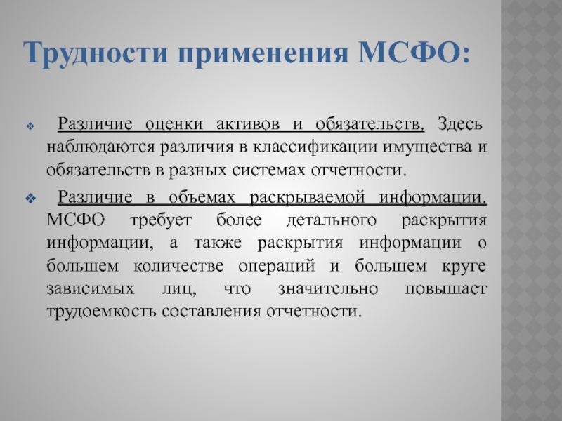 объемах раскрываемой информации. МСФО требует более детального раскрытия информации, а также раскрытия информации о большем количестве операций и большем круге зависимых лиц, что значительно повышает трудоемкость составления отчетности.