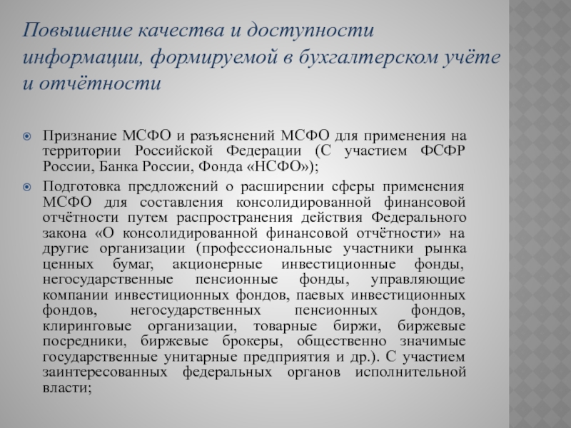 Подготовка предложений о расширении сферы применения МСФО для составления консолидированной финансовой отчётности путем распространения действия Федерального закона «О консолидированной финансовой отчётности» на другие организации (профессиональные участники рынка ценных бумаг, акционерные инвестиционные фонды, негосударственные пенсионные фонды, управляющие компании инвестиционных фондов, паевых инвестиционных фондов, негосударственных пенсионных фондов, клиринговые организации, товарные биржи, биржевые посредники, биржевые брокеры, общественно значимые государственные унитарные предприятия и др.). С участием заинтересованных федеральных органов исполнительной власти;