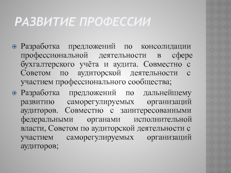 Разработка предложений по дальнейшему развитию саморегулируемых организаций аудиторов. Совместно с заинтересованными федеральными органами исполнительной власти, Советом по аудиторской деятельности с участием саморегулируемых организаций аудиторов;