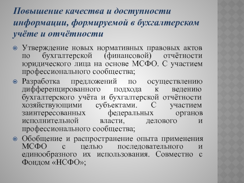Завершение приведения ранее принятых нормативных правовых актов по бухгалтерскому учёту и бухгалтерской (финансовой) отчётности юридического лица в соответствие с МСФО. С участием профессионального сообщества;