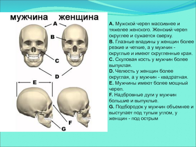 Слайд 44A. Мужской череп массивнее и тяжелее женского. Женский череп округлее
