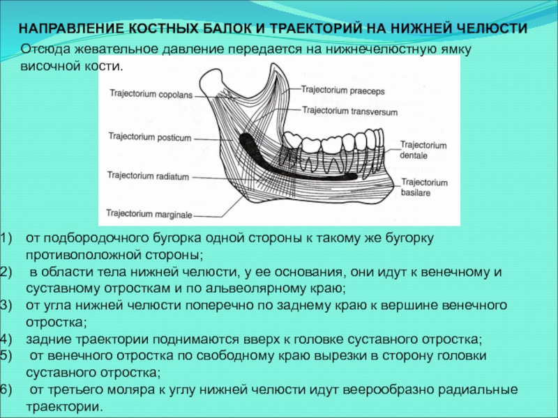 Слайд 15НАПРАВЛЕНИЕ КОСТНЫХ БАЛОК И ТРАЕКТОРИЙ НА НИЖНЕЙ ЧЕЛЮСТИ