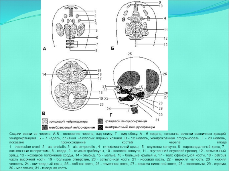 1 - trabeculae cranii, 2 - ala orbitalis, 3 - ala temporalis , 4 - гипофизальный хрящ , 5 - слуховая капсула, 6 - парахордальный хрящ, 7 - затылочные склеротомы, 8 - хорда, 9 - слитые трабекулы, 10 - носовая капсула, 11 - внутренний слуховой проход, 12 - затылочный хрящ, 13 - исходное положение хорды, 14 - этмоид, 15 - малые, 16 - большие крылья и, 17 - тело сфеноидной кости, 18 - petrous часть височной кости, 19 - большое отверстие, 20 - затылочная кость, 21 - носовая кость, 22 - верхняя челюсть, 23 - нижняя челюсть, 24 - щитовидный хрящ, 25 - лобная кость, 26 - теменная кость, 27 - squama височной кости, 28 - наковальня, 29 - стремя, 30 - молоточек, 31 - гиоидная кость
