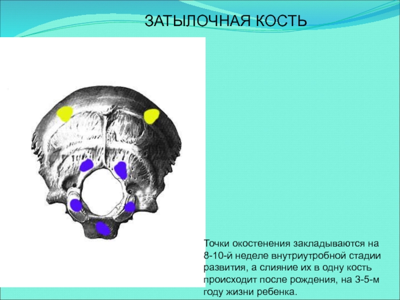 Слайд 22Точки окостенения закладываются на 8-10-й неделе внутриутробной стадии развития, а