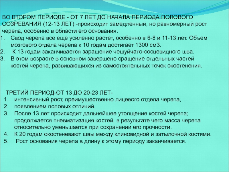 ПОЛОВОГО СОЗРЕВАНИЯ (12-13 ЛЕТ) -происходит замедленный, но равномерный рост черепа,