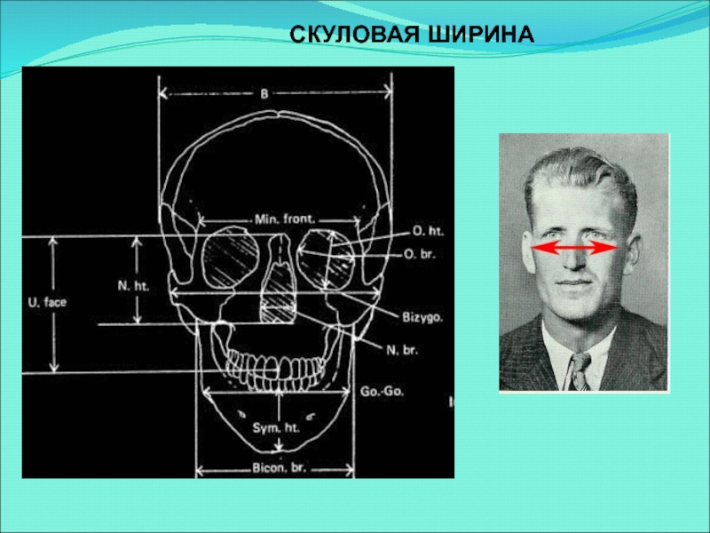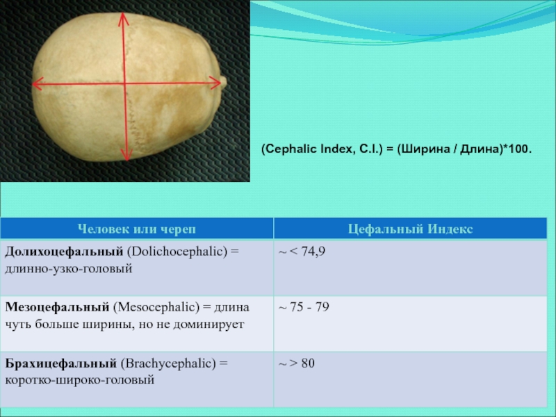 Слайд 38(Cephalic Index, C.I.) = (Ширина / Длина)*100.