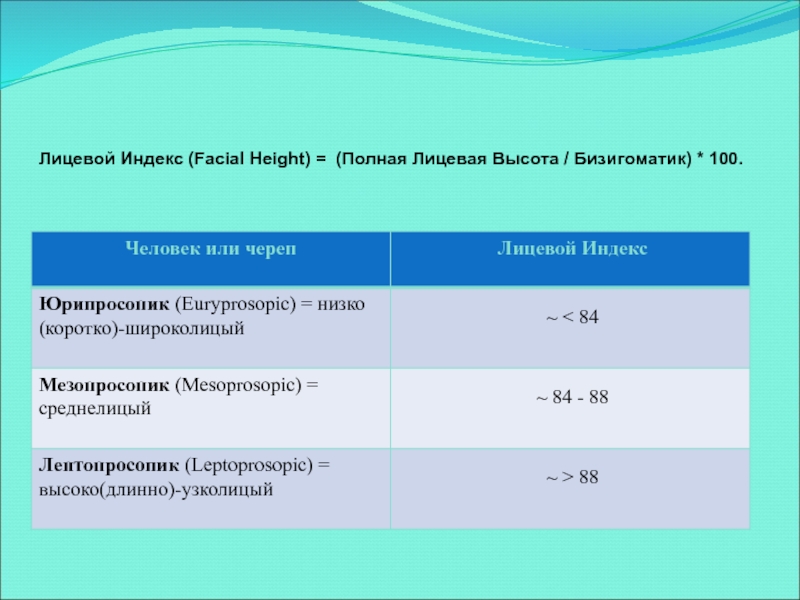 Слайд 41Лицевой Индекс (Facial Height) = (Полная Лицевая Высота / Бизигоматик)