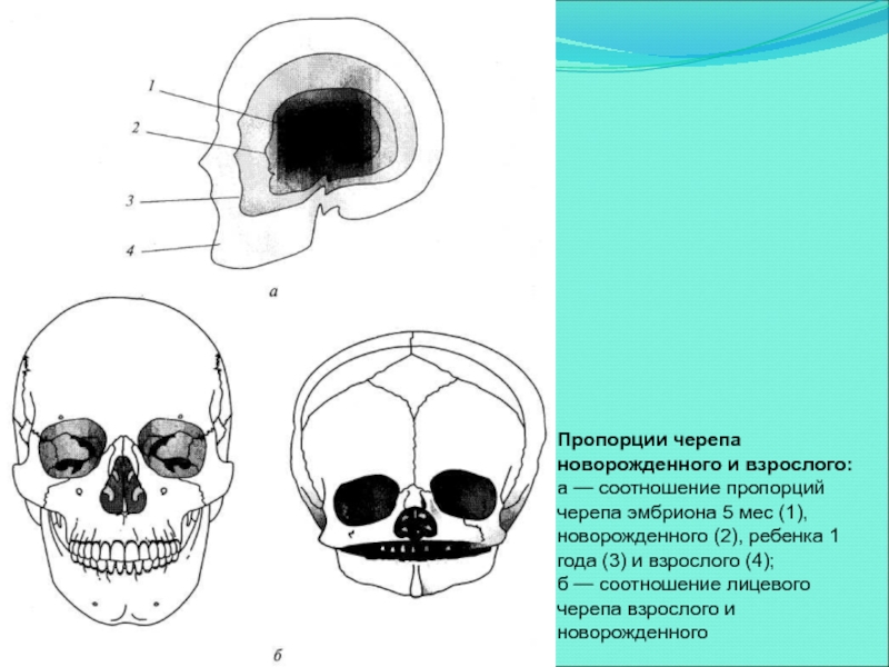 Слайд 33Пропорции черепа новорожденного и взрослого: