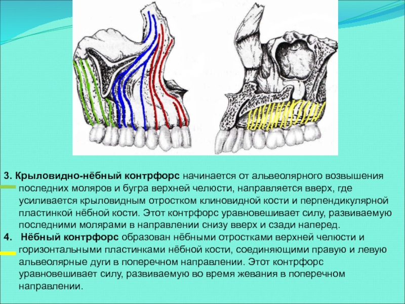 4. Нёбный контрфорс образован нёбными отростками верхней челюсти и горизонтальными пластинками нёбной кости, соединяющими правую и левую альвеолярные дуги в поперечном направлении. Этот контрфорс уравновешивает силу, развиваемую во время жевания в поперечном направлении.