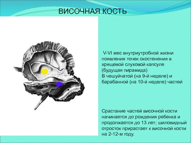 Срастание частей височной кости начинается до рождения ребенка и продолжается до 13 лет; шиловидный отросток прирастает к височной кости на 2-12-м году.
