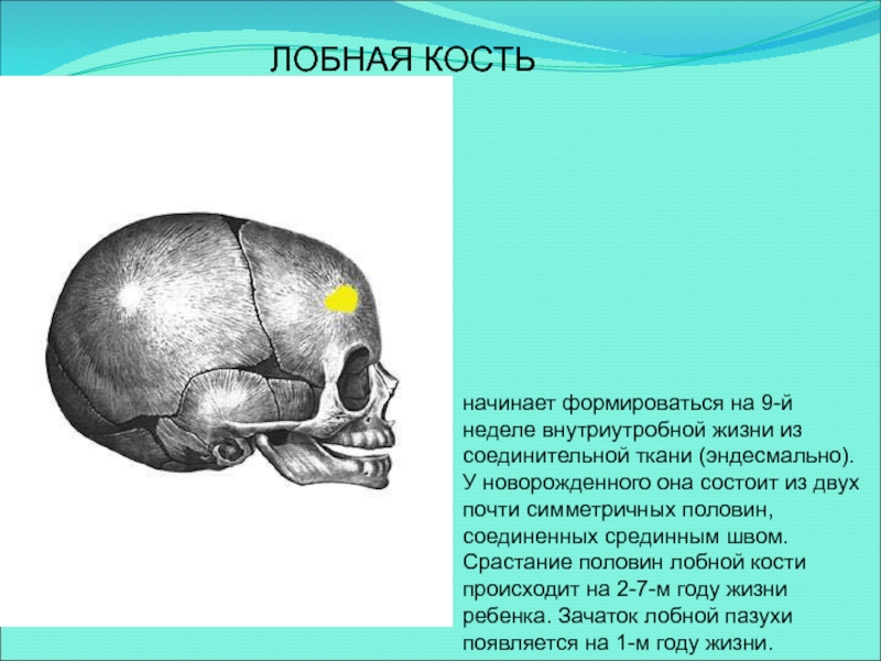 соединенных срединным швом. Срастание половин лобной кости происходит на 2-7-м году жизни ребенка. Зачаток лобной пазухи появляется на 1-м году жизни.