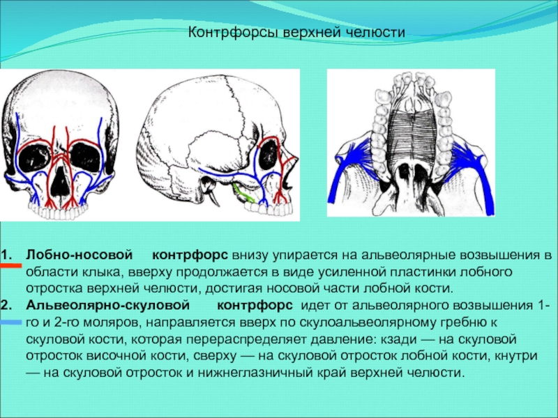 Слайд 12Лобно-носовой контрфорс внизу упирается на альвеолярные возвышения в