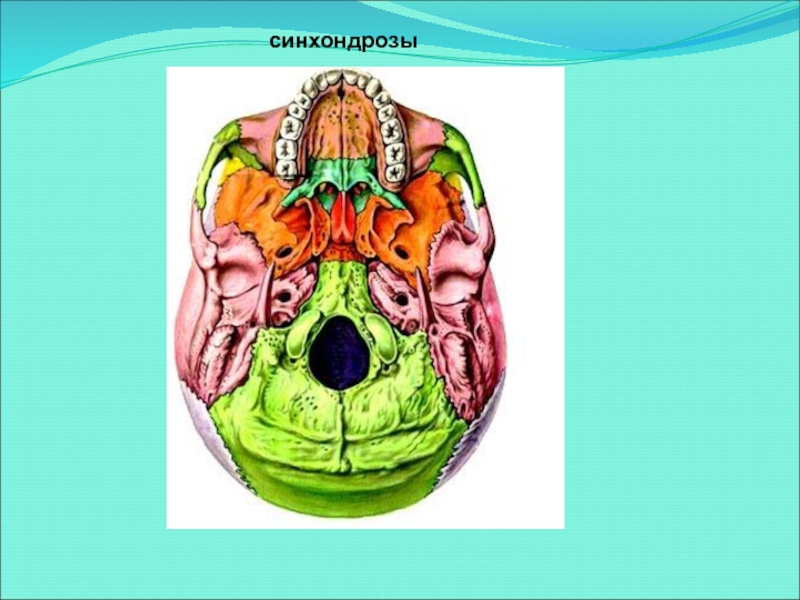 Основание черепа по сравнению со сводом отстает в росте, кости соединены друг с другом посредством широких хрящевых и соединительнотканных прослоек.