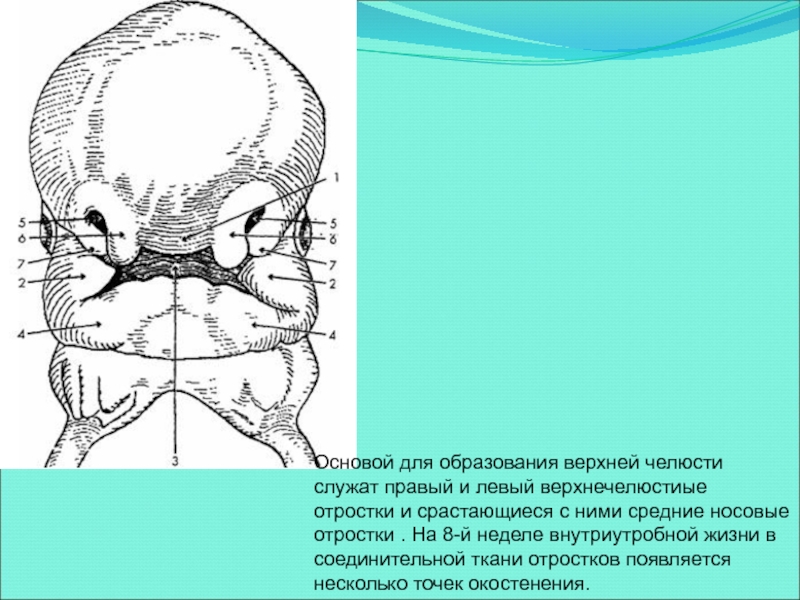 Слайд 25Основой для образования верхней челюсти служат правый и левый верхнечелюстиые