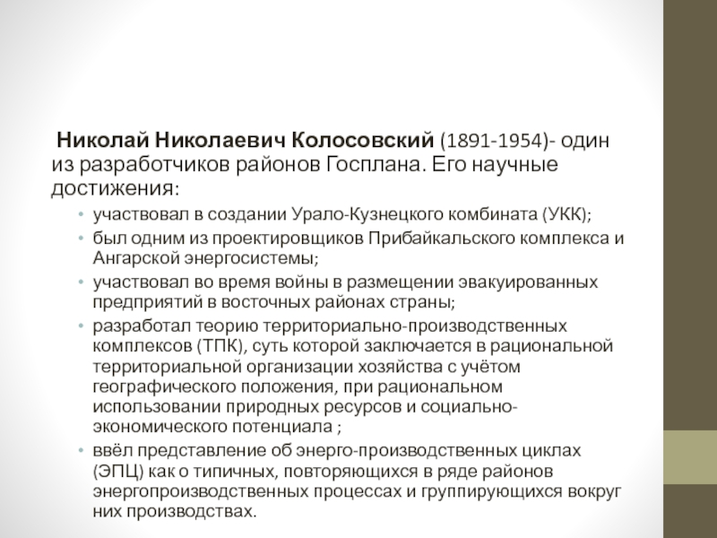 Слайд 8 Николай Николаевич Колосовский (1891-1954)- один из разработчиков районов Госплана. Его научные