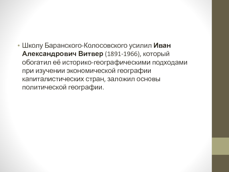 Слайд 11Школу Баранского-Колосовского усилил Иван Александрович Витвер (1891-1966), который обогатил её историко-географическими подходами