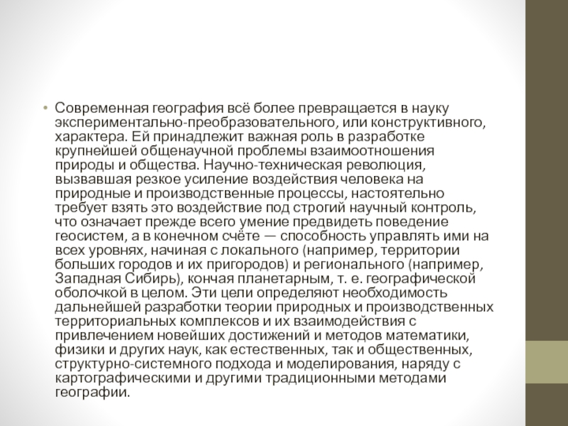 Слайд 13Современная география всё более превращается в науку экспериментально-преобразовательного, или конструктивного,