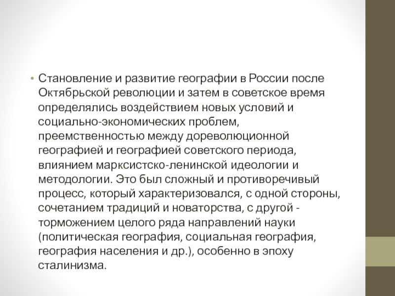 проблем, преемственностью между дореволюционной географией и географией советского периода, влиянием марксистско-ленинской идеологии и методологии. Это был сложный и противоречивый процесс, который характеризовался, с одной стороны, сочетанием традиций и новаторства, с другой - торможением целого ряда направлений науки (политическая география, социальная география, география населения и др.), особенно в эпоху сталинизма.