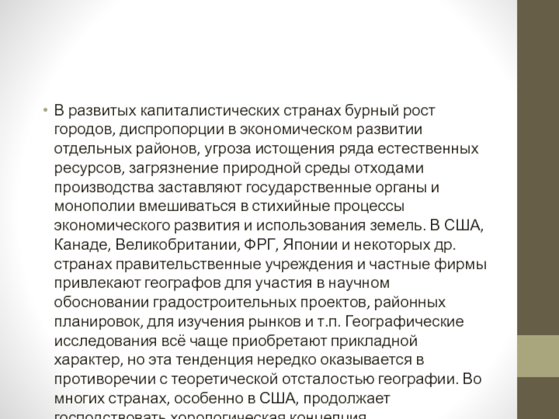 среды отходами производства заставляют государственные органы и монополии вмешиваться в стихийные процессы экономического развития и использования земель. В США, Канаде, Великобритании, ФРГ, Японии и некоторых др. странах правительственные учреждения и частные фирмы привлекают географов для участия в научном обосновании градостроительных проектов, районных планировок, для изучения рынков и т.п. Географические исследования всё чаще приобретают прикладной характер, но эта тенденция нередко оказывается в противоречии с теоретической отсталостью географии. Во многих странах, особенно в США, продолжает господствовать хорологическая концепция.