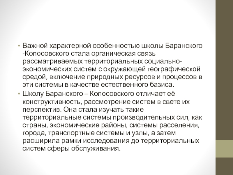 Слайд 10Важной характерной особенностью школы Баранского -Колосовского стала органическая связь рассматриваемых