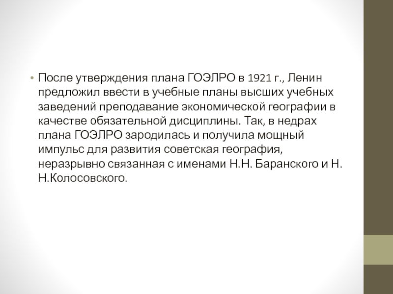 качестве обязательной дисциплины. Так, в недрах плана ГОЭЛРО зародилась и получила мощный импульс для развития советская география, неразрывно связанная с именами Н.Н. Баранского и Н.Н.Колосовского.