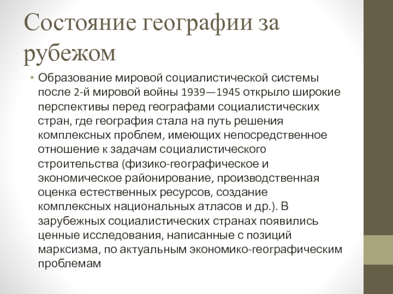 войны 1939—1945 открыло широкие перспективы перед географами социалистических стран, где