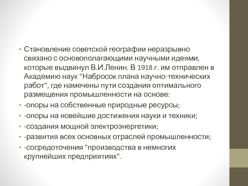 Слайд 3Становление советской географии неразрывно связано с основополагающими научными идеями, которые