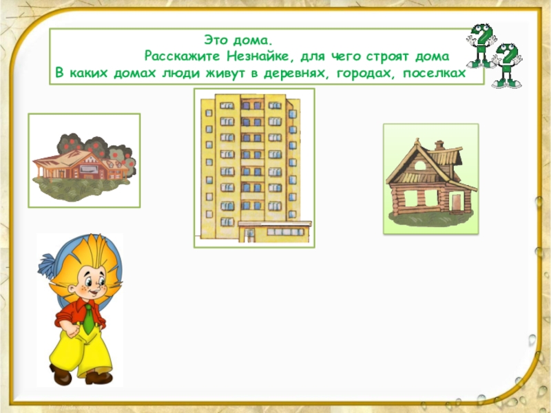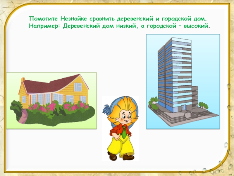 Слайд 8Помогите Незнайке сравнить деревенский и городской дом.