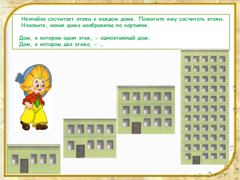 Слайд 4 Незнайка сосчитает этажи в каждом доме. Помогите ему