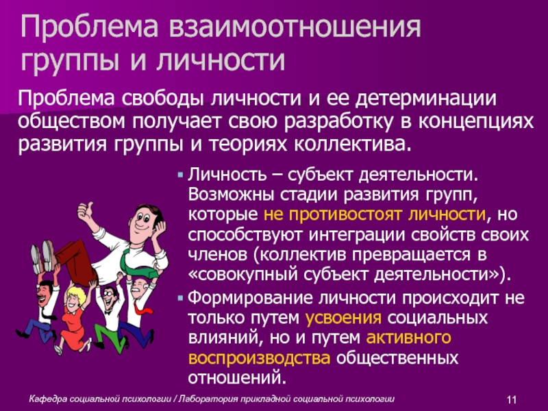 Личность – субъект деятельности. Возможны стадии развития групп, которые не противостоят личности, но способствуют интеграции свойств своих членов (коллектив превращается в «совокупный субъект деятельности»).