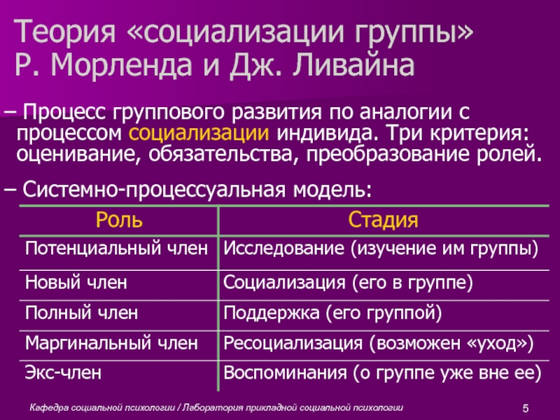 Процесс группового развития по аналогии с процессом социализации индивида. Три критерия: оценивание, обязательства, преобразование ролей.