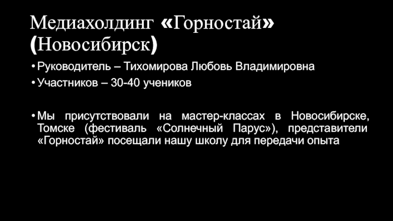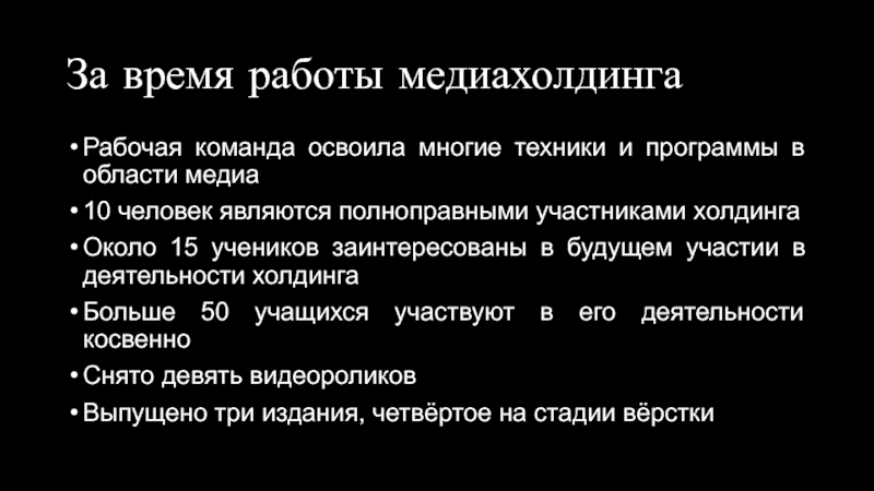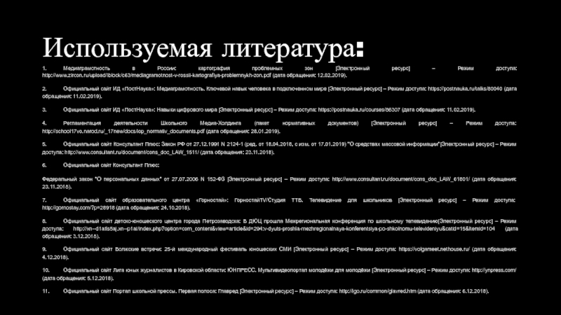 ![Развитие медианавыков учащихся через организацию в школе медиахолдинга Используемая литература:1. Медиаграмотность в России: картография проблемных зон [Электронный ресурс] – Режим Используемая литература:1. Медиаграмотность в России: картография проблемных зон [Электронный ресурс] – Режим доступа: http://www.zircon.ru/upload/iblock/c63/mediagramotnost-v-rossii-kartografiya-problemnykh-zon.pdf (дата обращения: 12.02.2019).2. Официальный сайт](/img/tmb/3/273732/e3b6652cb715c2fdaca382b411895e7e-800x.jpg)