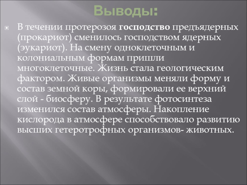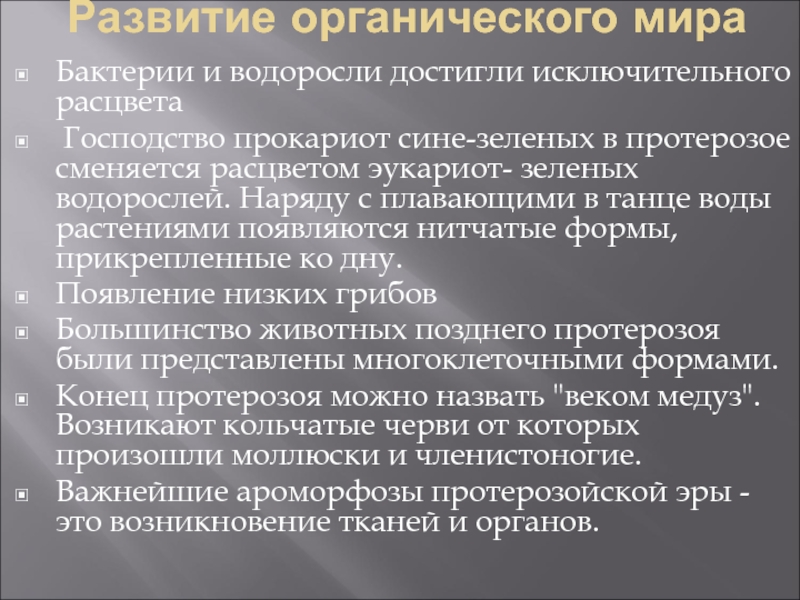 В течении протерозоя господство предъядерных (прокариот) сменилось господством ядерных (эукариот). На смену