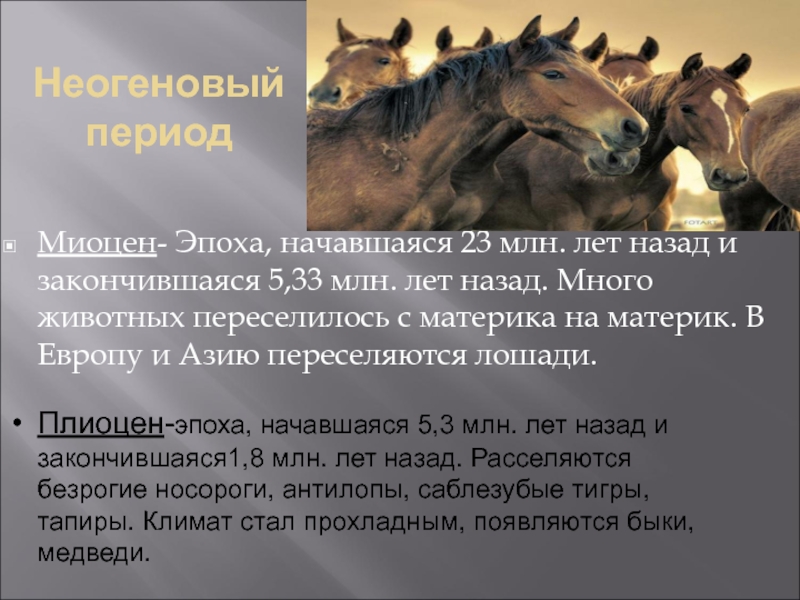 Плиоцен-эпоха, начавшаяся 5,3 млн. лет назад и закончившаяся1,8 млн. лет назад. Расселяются безрогие носороги, антилопы, саблезубые тигры, тапиры. Климат стал прохладным, появляются быки, медведи.