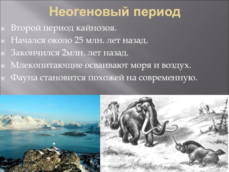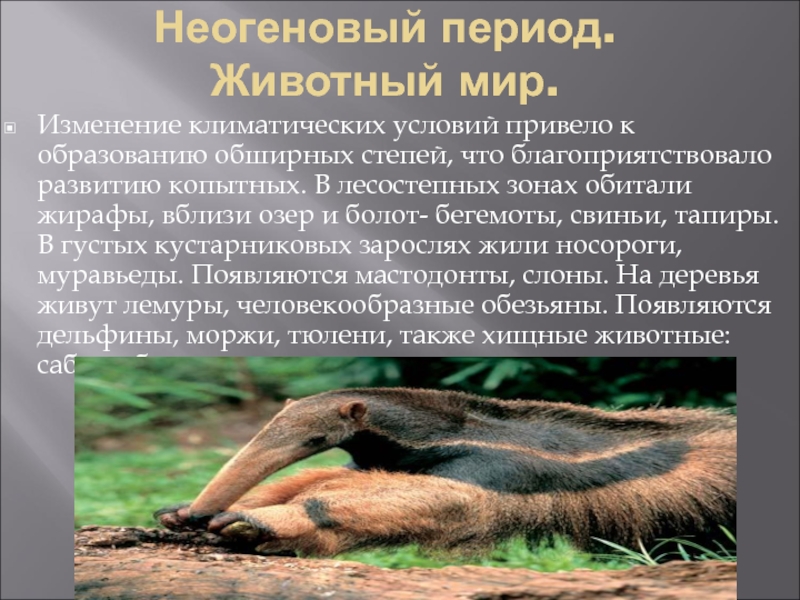 озер и болот- бегемоты, свиньи, тапиры. В густых кустарниковых зарослях жили носороги, муравьеды. Появляются мастодонты, слоны. На деревья живут лемуры, человекообразные обезьяны. Появляются дельфины, моржи, тюлени, также хищные животные: саблезубые тигры, гиены.