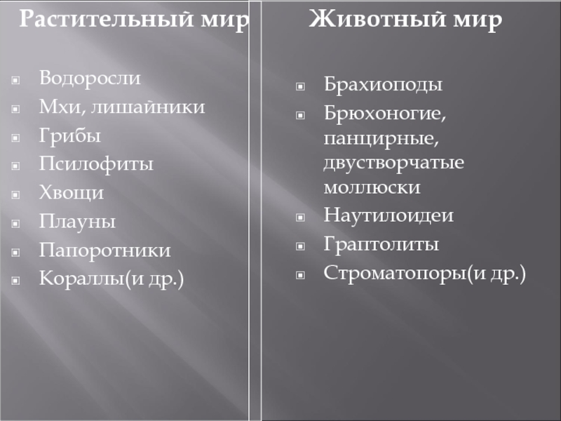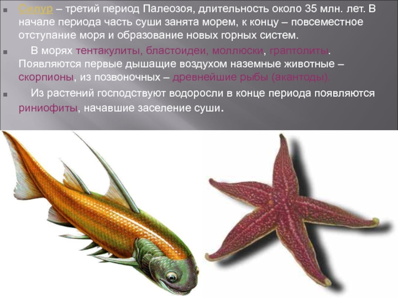 В морях тентакулиты, бластоидеи, моллюски, граптолиты. Появляются первые дышащие воздухом наземные животные – скорпионы, из позвоночных – древнейшие рыбы (акантоды).