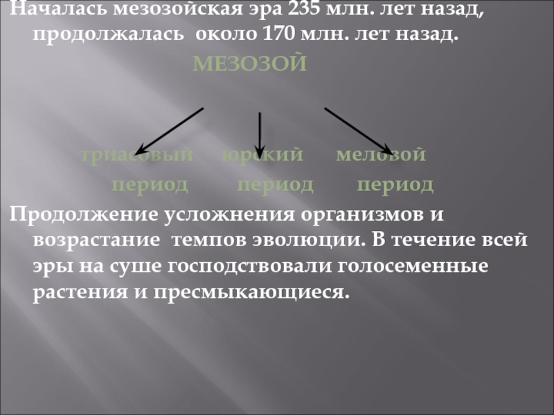 Продолжение усложнения организмов и возрастание темпов эволюции. В течение всей эры на суше господствовали голосеменные растения и пресмыкающиеся.