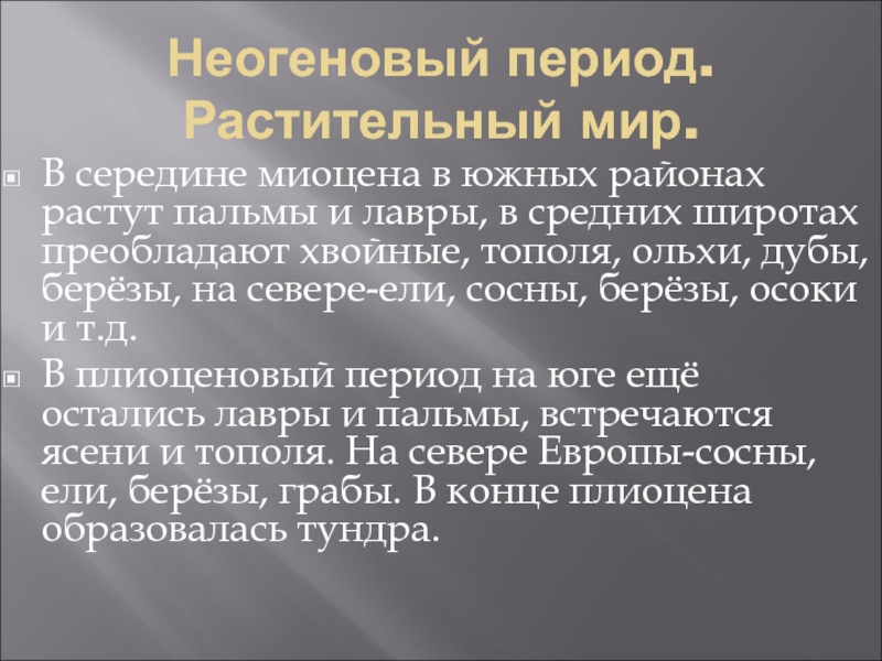 В плиоценовый период на юге ещё остались лавры и пальмы, встречаются ясени и тополя. На севере Европы-сосны, ели, берёзы, грабы. В конце плиоцена образовалась тундра.