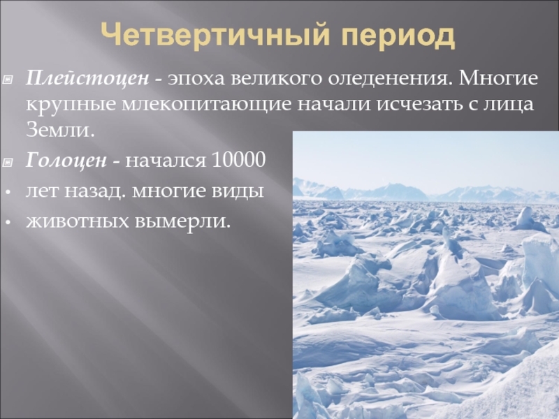 Плейстоцен - эпоха великого оледенения. Многие крупные млекопитающие начали