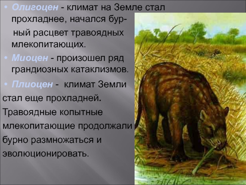 Слайд 32Олигоцен - климат на Земле стал прохладнее, начался бур-
