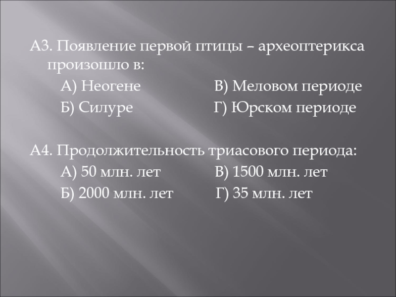 Слайд 51А3. Появление первой птицы – археоптерикса произошло в: