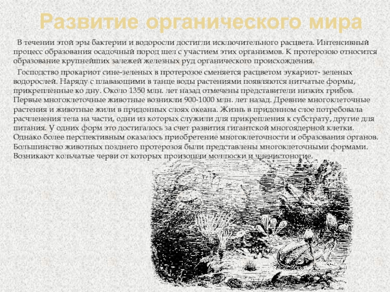 Господство прокариот сине-зеленых в протерозое сменяется расцветом эукариот- зеленых водорослей. Наряду с плавающими в танце воды растениями появляются нитчатые формы, прикрепленные ко дну. Около 1350 млн. лет назад отмечены представители низких грибов. Первые многоклеточные животные возникли 900-1000 млн. лет назад. Древние многоклеточные растения и животные жили в придонных слоях океана. Жизнь в придонном слое потребовала расчленения тела на части, одни из которых служили для прикрепления к субстрату, другие для питания. У одних форм это достигалось за счет развития гигантской многоядерной клетки. Однако более перспективным оказалось приобретение многоклеточности и образования органов. Большинство животных позднего протерозоя были представлены многоклеточными формами. Возникают кольчатые черви от которых произошли моллюски и членистоногие.