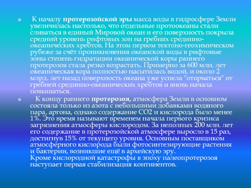 Слайд 16 К началу протерозойской эры масса воды в гидросфере Земли увеличилась настолько,