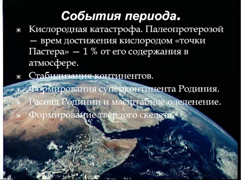 Кроме кислородной катастрофы в эпоху палеопротерозоя наступает первая стабилизация континентов.