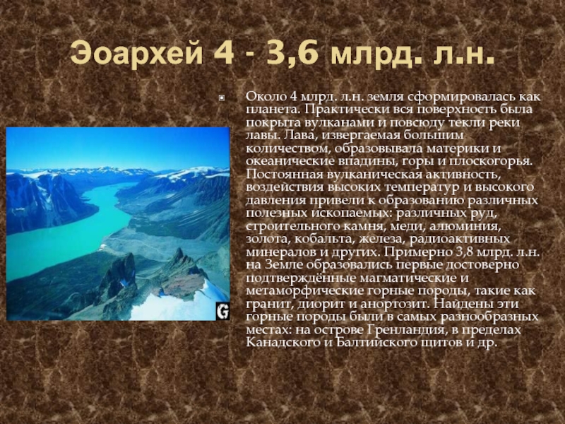 повсюду текли реки лавы. Лава, извергаемая большим количеством, образовывала материки и океанические впадины, горы и плоскогорья. Постоянная вулканическая активность, воздействия высоких температур и высокого давления привели к образованию различных полезных ископаемых: различных руд, строительного камня, меди, алюминия, золота, кобальта, железа, радиоактивных минералов и других. Примерно 3,8 млрд. л.н. на Земле образовались первые достоверно подтверждённые магматические и метаморфические горные породы, такие как гранит, диорит и анортозит. Найдены эти горные породы были в самых разнообразных местах: на острове Гренландия, в пределах Канадского и Балтийского щитов и др.