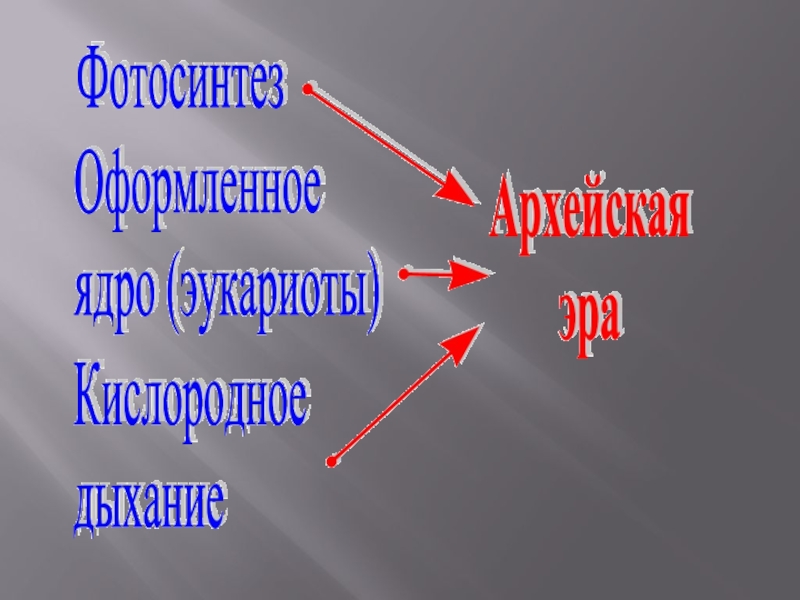 2. Следующим ароморфозом, этапом было появление процесса фотосинтеза. Сначала зеленые и пурпурные серобактерии, которые из углекислого газа и сероводорода за счет энергии света образовывали органику с выделением серы: СО2 + 2Н2S + Q ? (СН2О) + 2S + Н2О 3. Позже появляются синезеленые (цианобактерии). Фотосинтез синезеленых — важнейший ароморфоз архейской эры. Благодаря их жизнедеятельности атмосфера начинает обогащаться кислородом. СО2 + 2Н2О + Q ? (СН2О) + О2 + Н2О