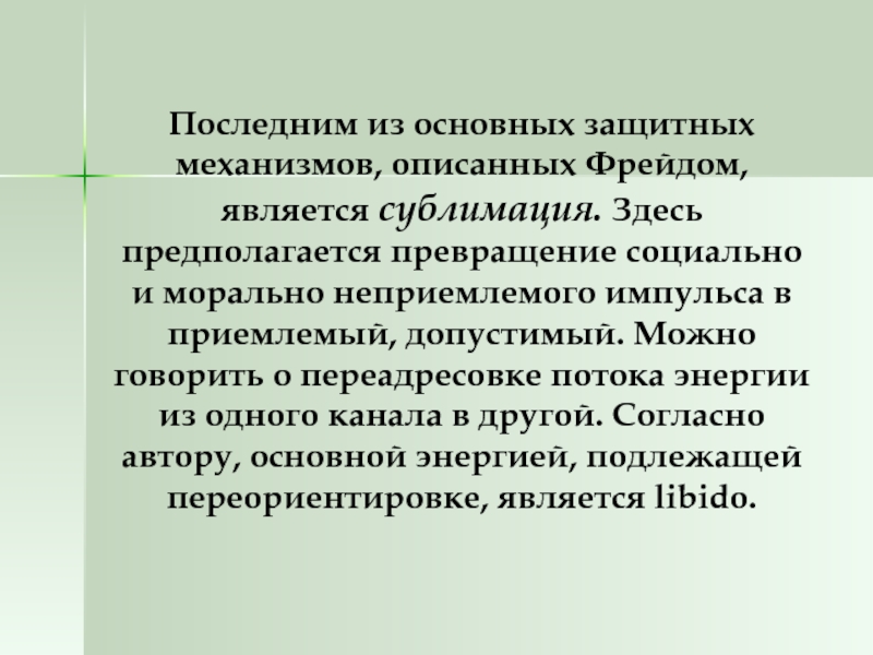 Слайд 139Последним из основных защитных механизмов, описанных Фрейдом, является сублимация. Здесь