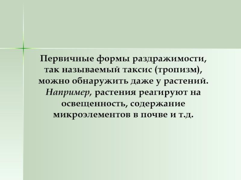 Слайд 34Первичные формы раздражимости, так называемый таксис (тропизм), можно обнаружить даже